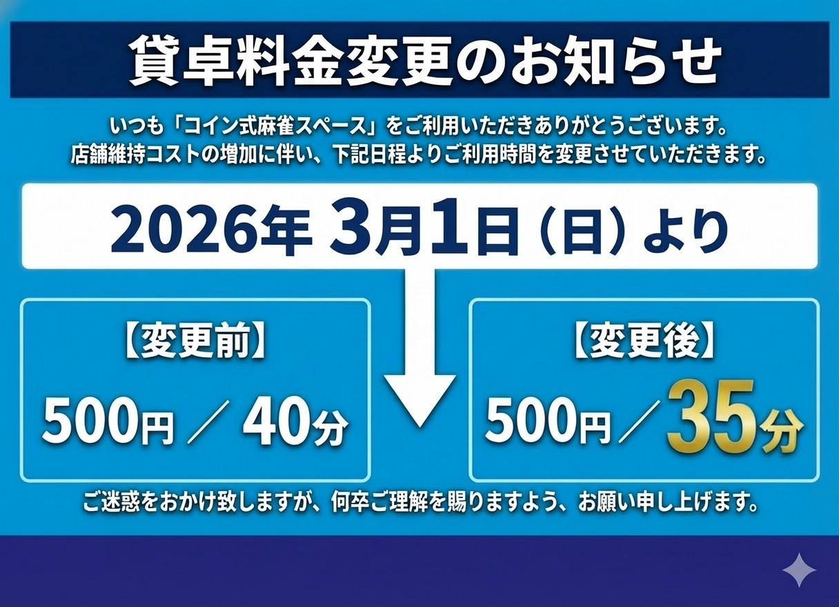 当店では簡単な設定や点棒の交換をセルフサービスにする事により地域最安値を実現しています!
